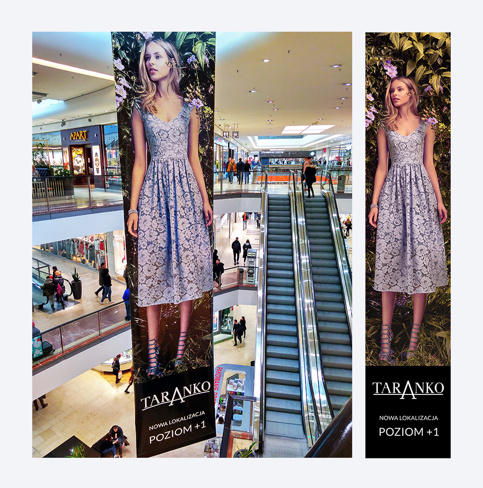 Projekt i przygotowanie do druku banerów reklamowych typu flaga, które zawisły w Galerii Bałtyckiej w Gdańsku. Banery zostały wykonanane na podstawie zdjęć wizerunkowych marki Taranko. Grafiki widoczne były z każdego poziomu galerii, ponieważ zamocowane zostały pod sufitem na najwyższym piętrze, a dosięgały aż do najniżej położonego poziomu.