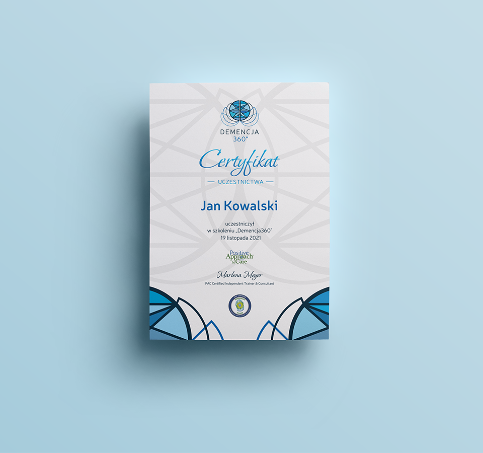 Znak Demencja 360° powstał dla fundacji zajmującej się edukacją na temat chorób związanych z demencją. Misją fundacji jest budowanie świadomości, przekazywanie wiedzy, zmiana jakości opieki na chorymi i poprawa życia ich rodzin. Głównymi odbiorcami fundacji są domy pomocy społecznej, uczelnie medyczne, terapeuci, psychologowie, zawody medyczne, ale również architekci i projektanci wnętrz tworzących infrastrukturę domów opieki.