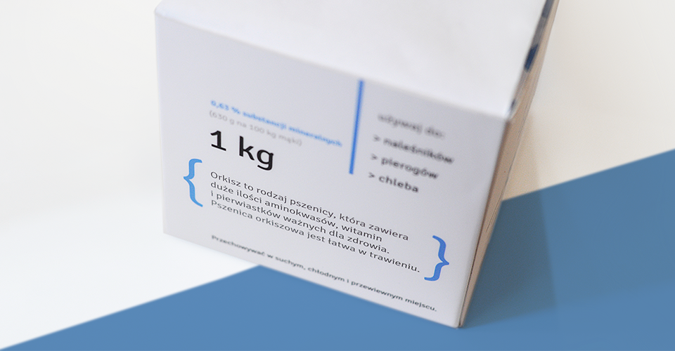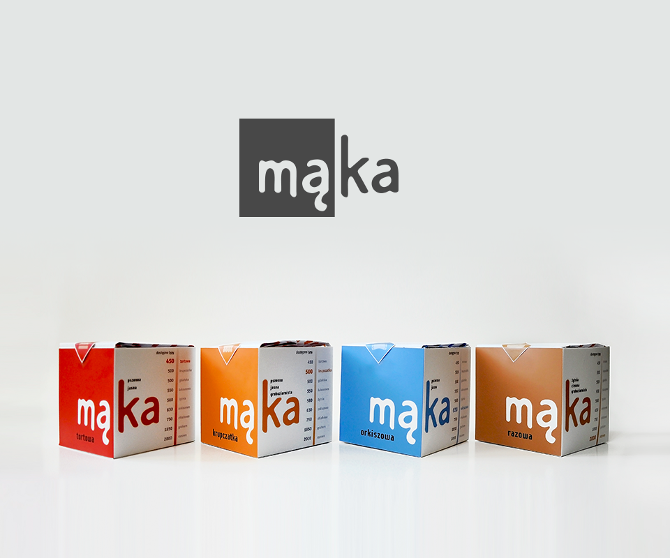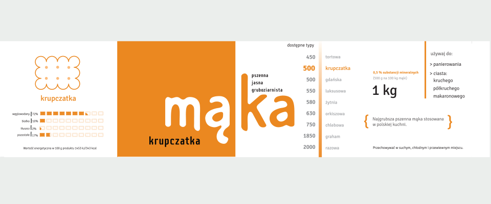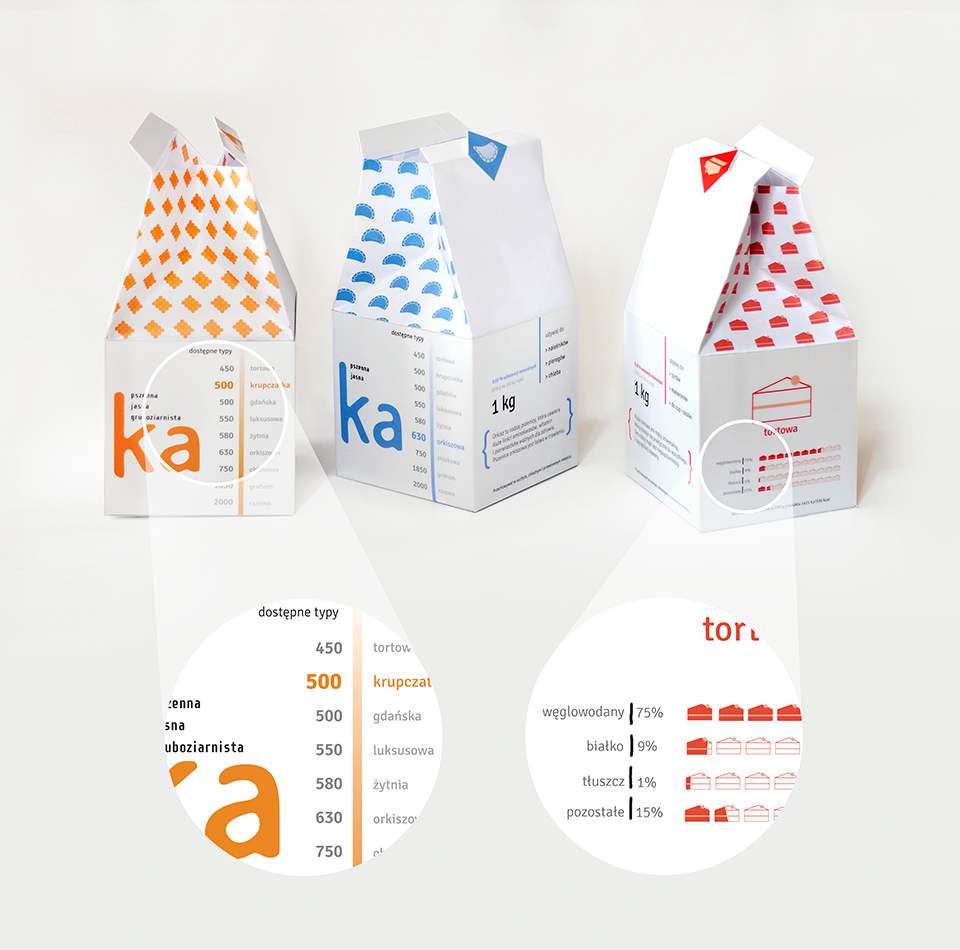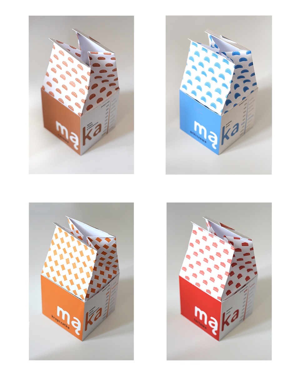 Projekt opakowania na mąkę uwzględniający jej odmienne typy oraz ich dostosowanie do różnych rodzajów wypieków. Sześcienny kształt opakowania ułatwia przechowywanie produktu, a sztywne dno pozwala pewnie utrzymać je w dłoni. Krótkie opisy na opakowaniu mają pomóc w wyborze najodpowiedniejszego typu mąki. O zawartości substancji odżywczych informują przejrzyste infografiki.