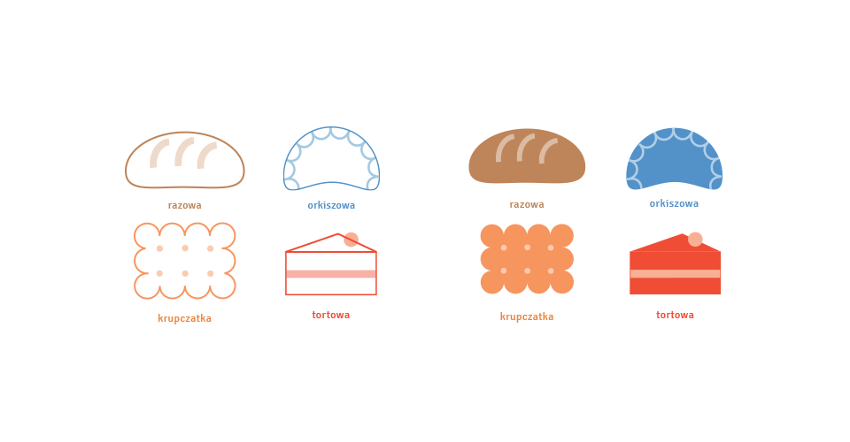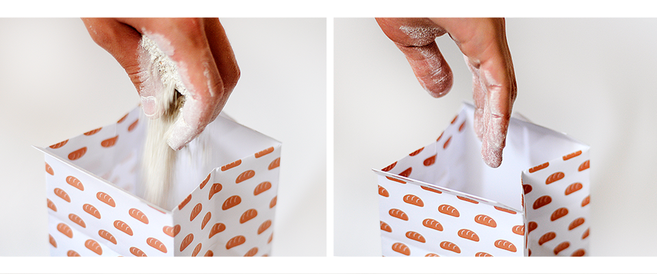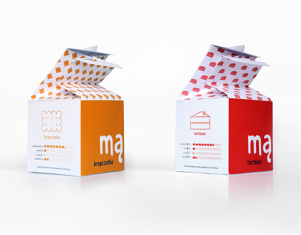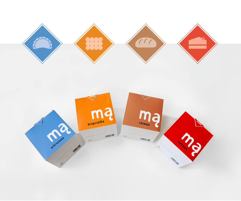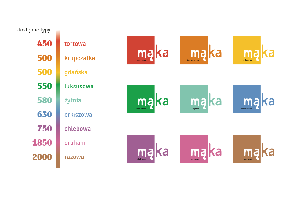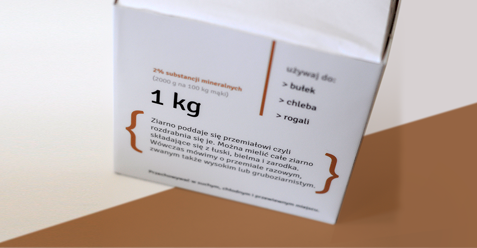 Projekt opakowania na mąkę uwzględniający jej odmienne typy oraz ich dostosowanie do różnych rodzajów wypieków. Sześcienny kształt opakowania ułatwia przechowywanie produktu, a sztywne dno pozwala pewnie utrzymać je w dłoni. Krótkie opisy na opakowaniu mają pomóc w wyborze najodpowiedniejszego typu mąki. O zawartości substancji odżywczych informują przejrzyste infografiki.