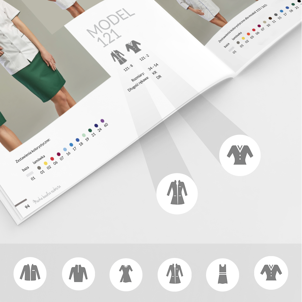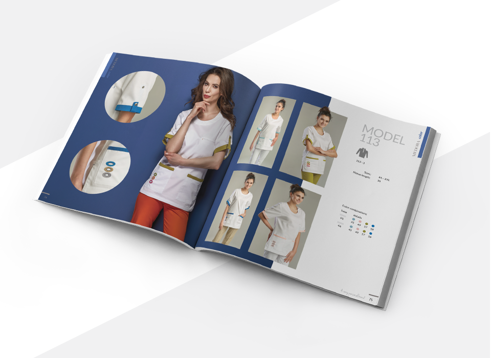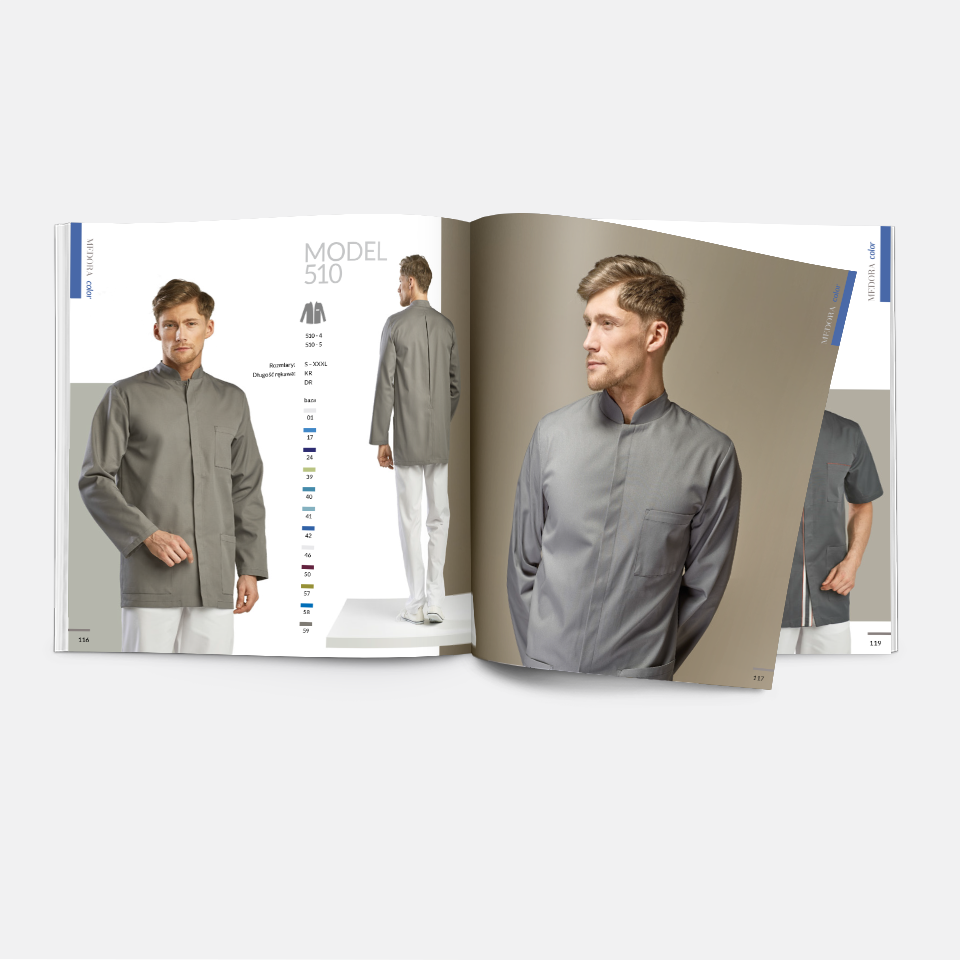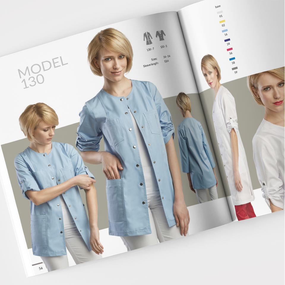 Katalog produktowy zaprojektowany dla firmy zajmującej się produkcją ekskluzywnej odzieży medycznej. Każda strona została stworzona jako oddzielna kompozycja, którą łączy wspólny system oznakowania kolorów i dodatków, a także piktogramów.