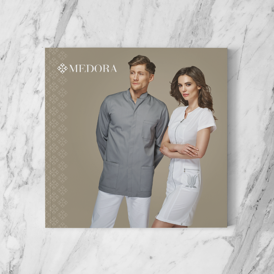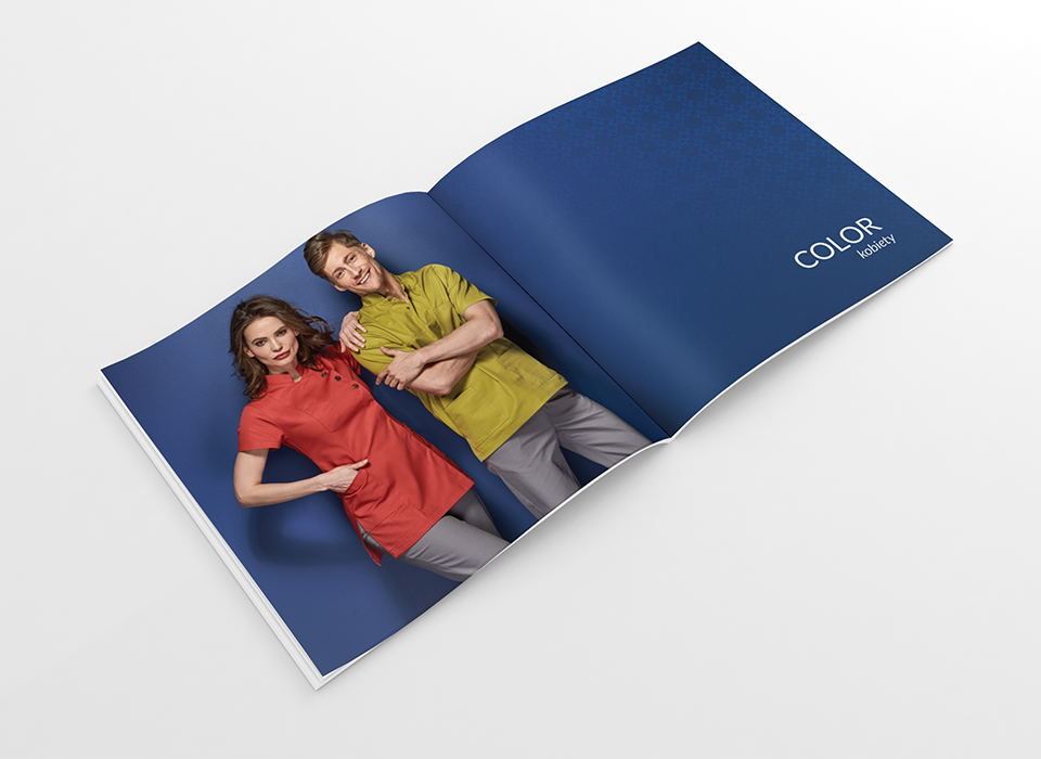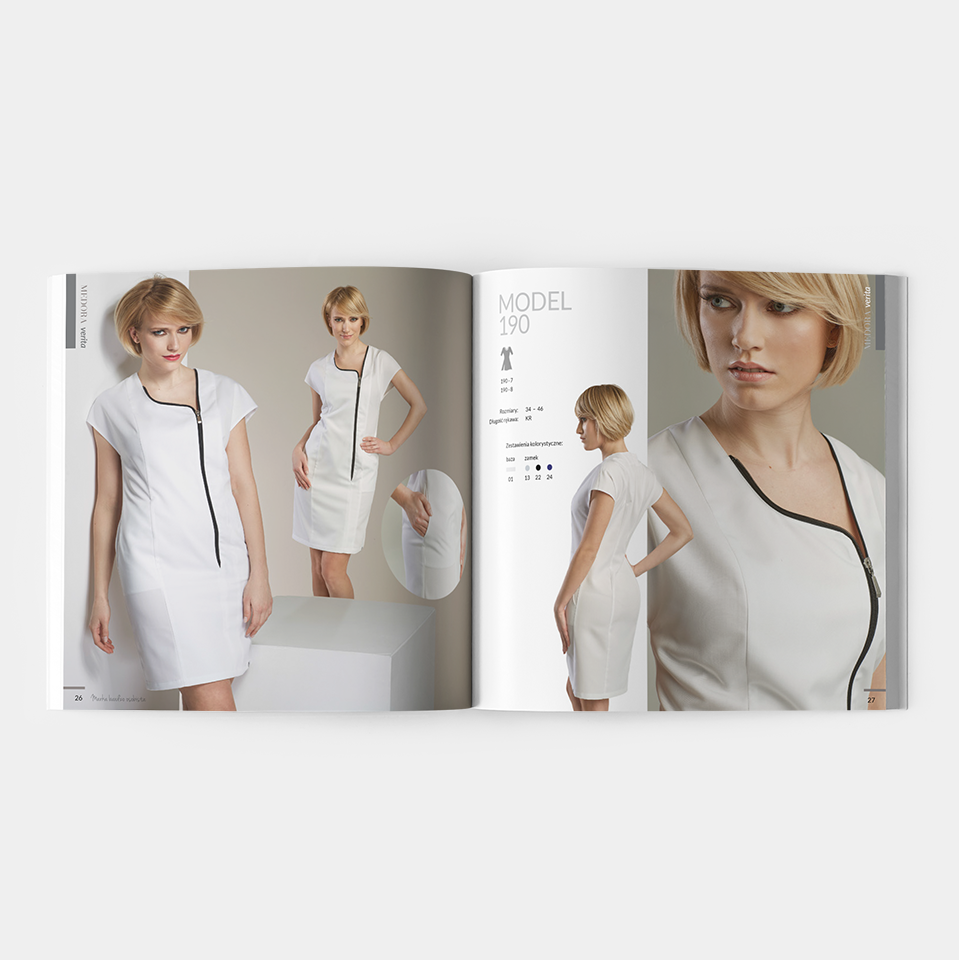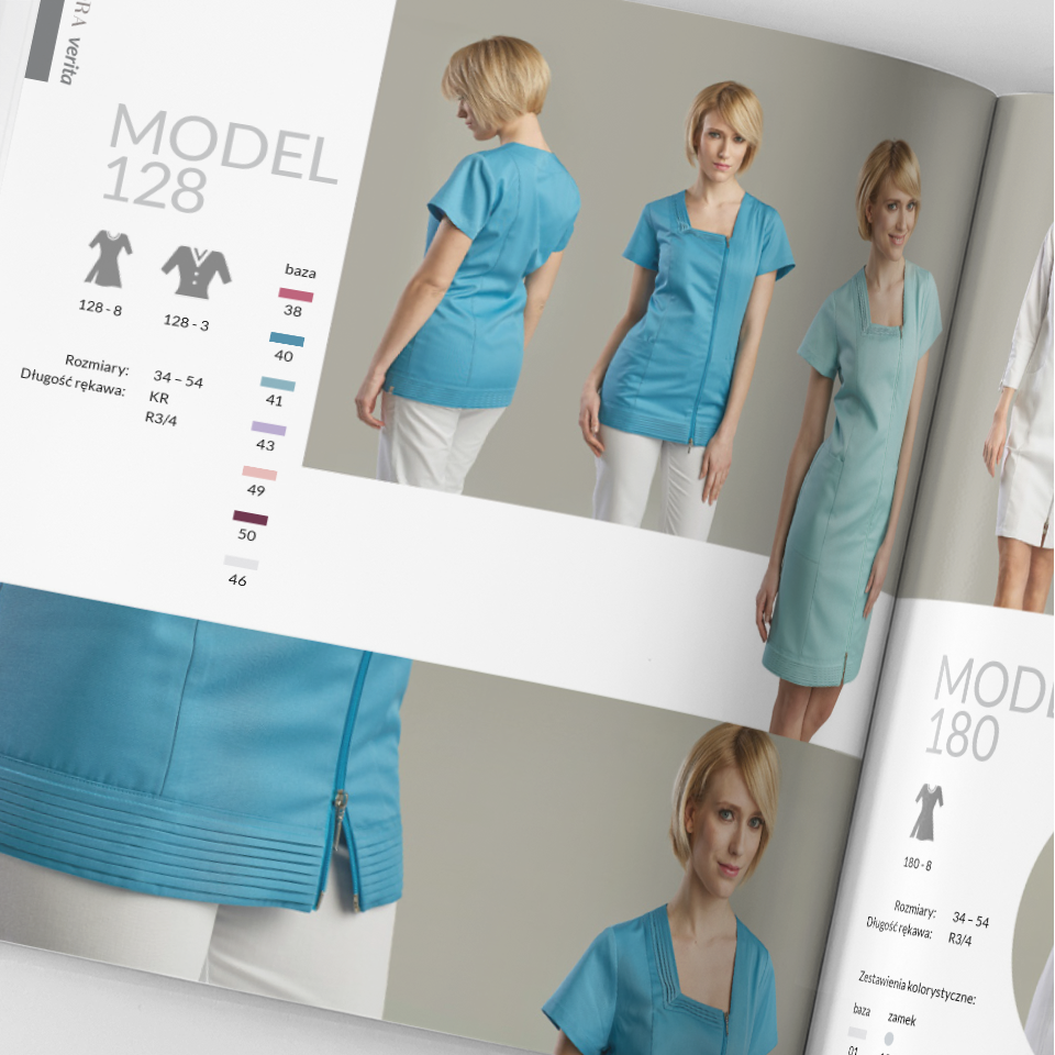 Katalog produktowy zaprojektowany dla firmy zajmującej się produkcją ekskluzywnej odzieży medycznej. Każda strona została stworzona jako oddzielna kompozycja, którą łączy wspólny system oznakowania kolorów i dodatków, a także piktogramów.